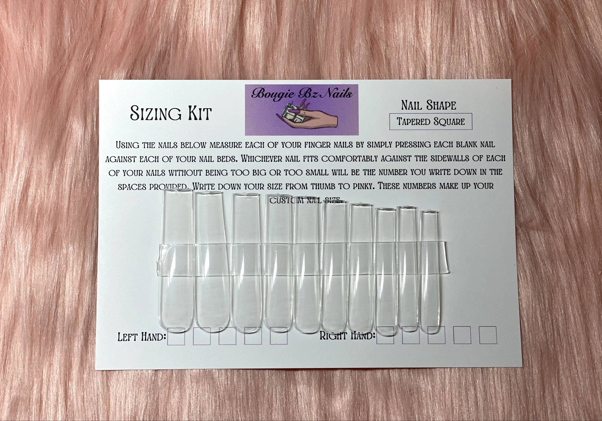 All new clients receive a free sizing kit after purchasing a set of press on nails. You may also purchase a sizing kit without buying a set of nails and pick out your designs later.